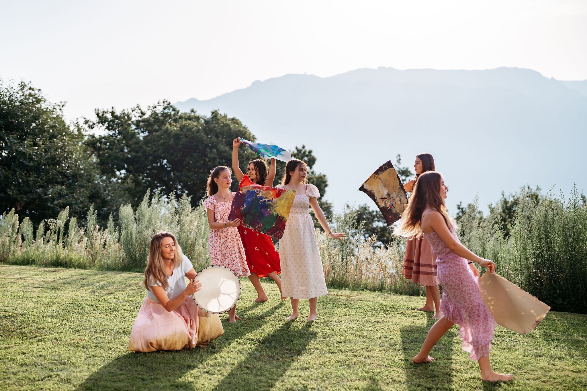 An art studio is set up to include stretched and raw canvas, acrylic paint, oil pastels, watercolors, sound bowls, drums, crystals and more. Alex will guide kids to begin expressing their creativity through painting, movement/dance and ceremony. Imagine dancing, painting and surrounding yourself with your own creative magic. It’s like our Rainbow Weavers camp but tailored to your own kids unique creativity! Children sometimes create songs, poems, stories or offerings to nature during our time together.